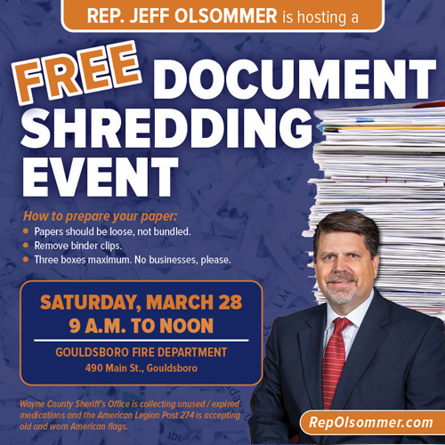 HAWLEY – Rep. Jeff Olsommer (R-Pike/Wayne) wants the residents of Wayne and Pike counties to know about a free event to shred personal documents, safely get rid of old medications, and properly dispose of worn American flags.