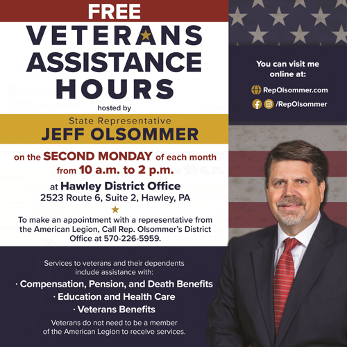 HAWLEY – Rep. Jeff Olsommer (R-Pike/Wayne) is reminding veterans and their families that help is available in the district office.