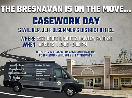 Mark your calendar – The Bresnavan, a mobile constituent services office for Congressman Rob Bresnahan, will be at my district office on Wednesday, April 15 from 10 a.m. to 3 p.m.